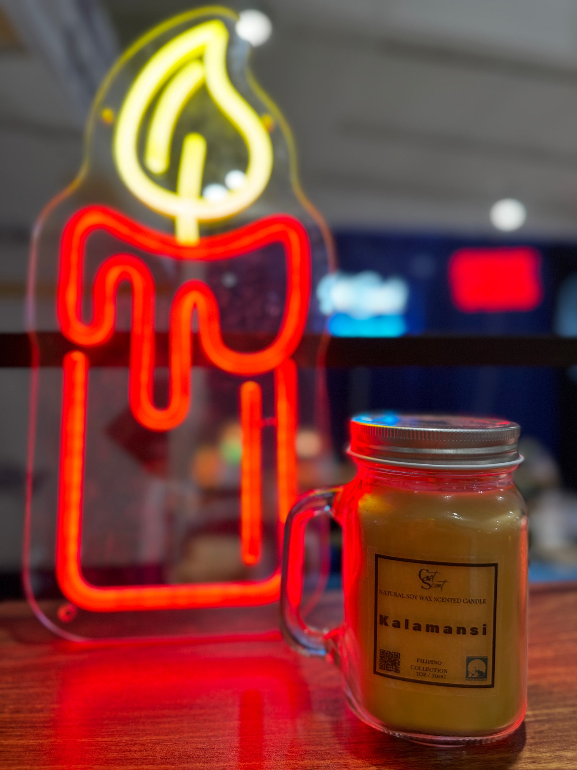 Get Scent KALAMANSI scented candle has a citrusy, sweet, sour and a hint of sugarcane and papaya aroma. Kalamansi is ubiquitous in traditional Philippine cuisine. Available in our 8oz clear straight jar with cotton wick!