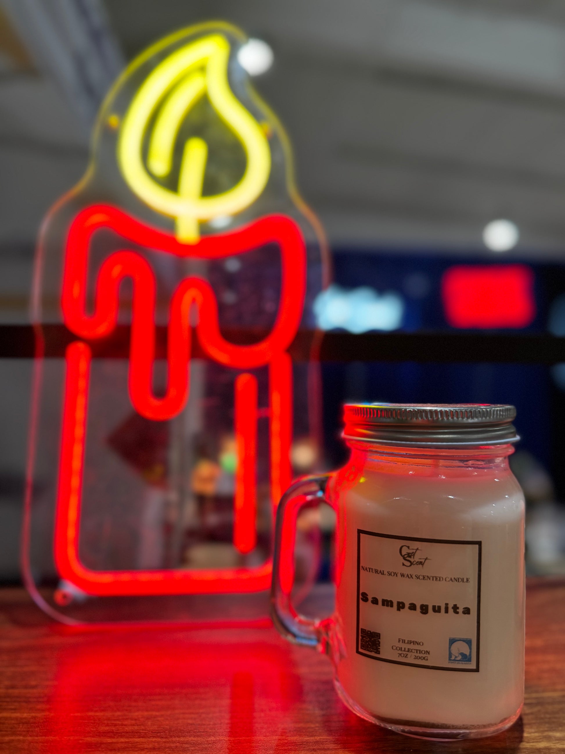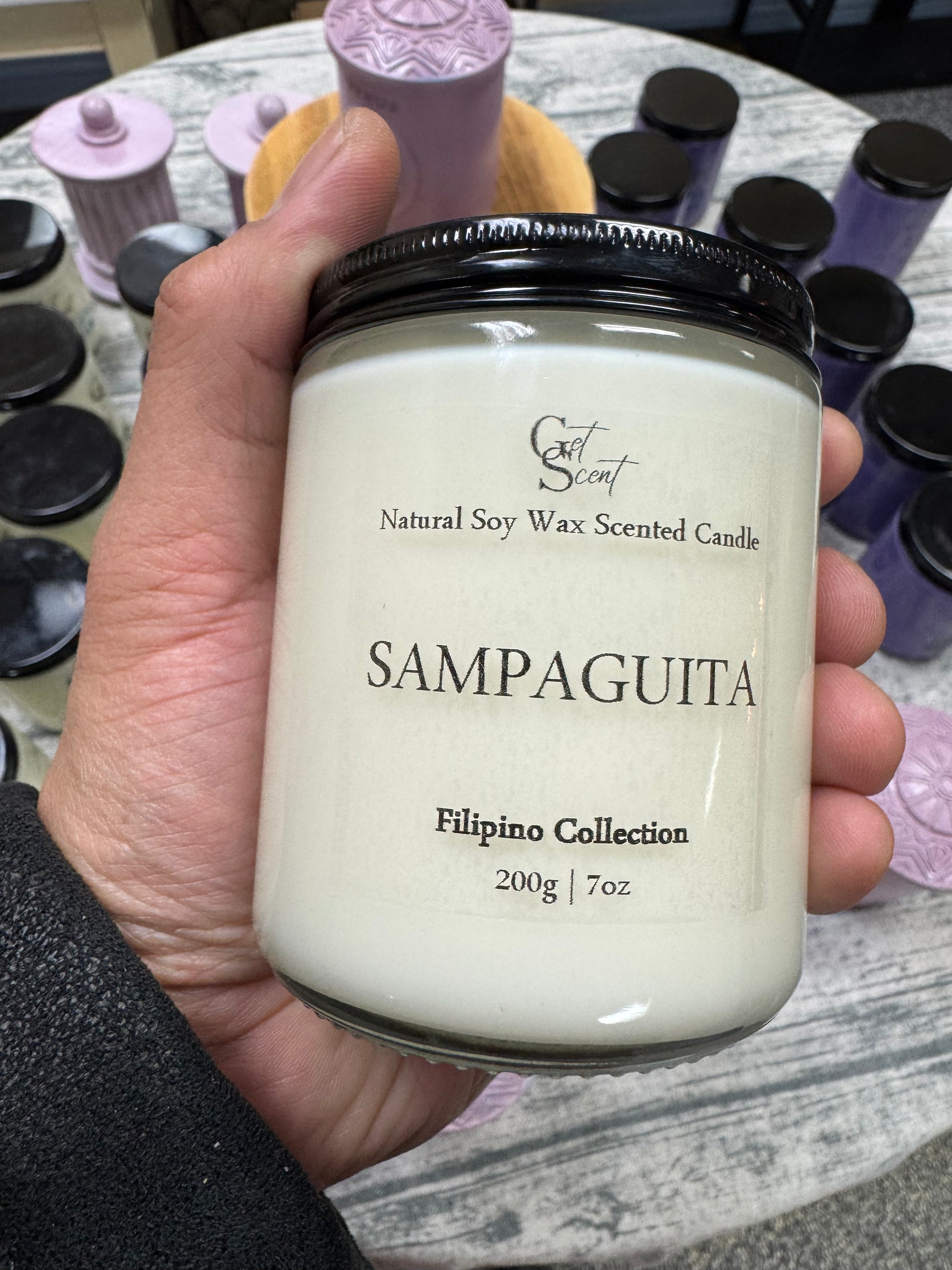 Get Scent SAMPAGUITA scented candle has a sweet and delicate exotic flower notes that are both calming and uplifting. Sampaguita is the Philippines' national flower. Available in our 8oz clear straight jar with cotton wick!